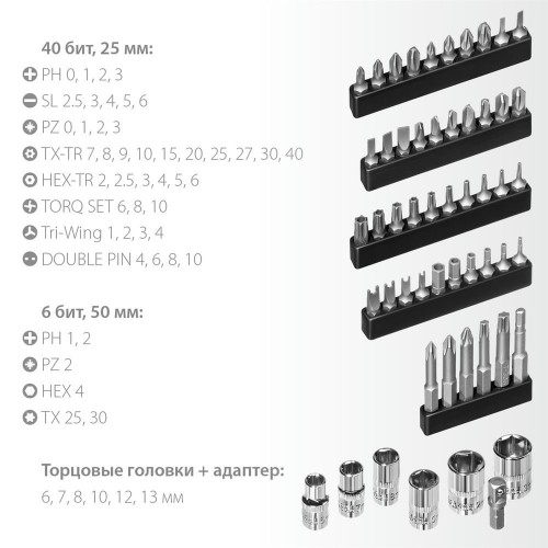Профессиональный набор c реверсивно-рычажной отверткой, набором высокопрочных бит и торцовыми головками для применения в комплекте с ручным и электроинструментомПрименение