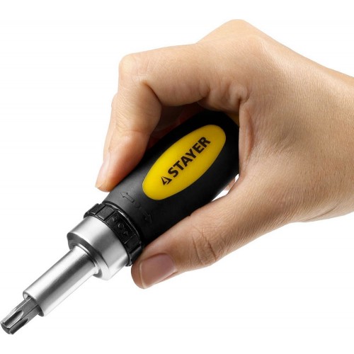 Набор инструментов STAYER 2557-H338, предназначен для монтажа и демонтажа резьбовых соединений с применением значительных усилий. Эргономичная двухкомпонентная рукоятка обеспечивает надежный и комфортный захват. Оснащена реверсивным храповым механизмом. Направление вращения меняется одной рукой. Биты из хромованадиевой стали обладают повышенной прочностью и долговечностью. Торцевые головки из высококачественной углеродистой стали.