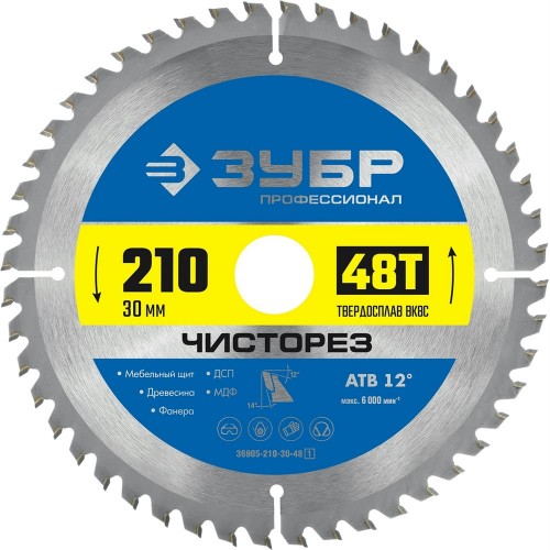 Пильный диск по дереву ЗУБР 36905-210-30-48_z01, предназначен для точного и чистого распила всех типов древесины (мебельный щит, ДСП, фанера и т.п.) Твердосплавные резцы марки ВК8С. Автоматизированная высококачественная пайка для надежного крепления зубьев. Закаленный корпус из высоколегированной стали препятствует возникновению биений при работе. Компьютерная балансировка диска для предотвращения биений при работе. Автоматическая трехсторонняя шлифовка зубьев для максимально точной геометрии режущих элементов и чистого реза.