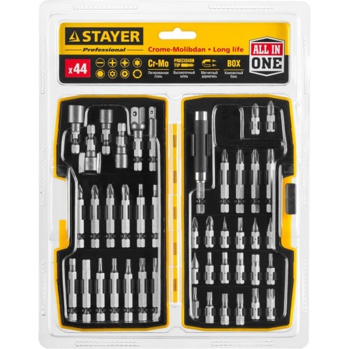 Набор бит STAYER 26135-H44, применяется при монтаже и демонтаже резьбовых соединений. Высококачественная легированная хромомолибденовая сталь обеспечивает высокую механическую прочность. Точная геометрия шлицов обеспечивает точную посадку в крепеже. Адаптер с магнитным держателем обеспечивает быструю и надежную фиксацию насадки. Эргономичный пластиковый кейс для удобного хранения и переноски.