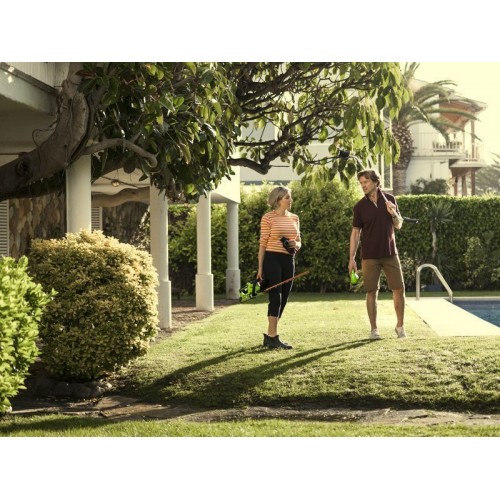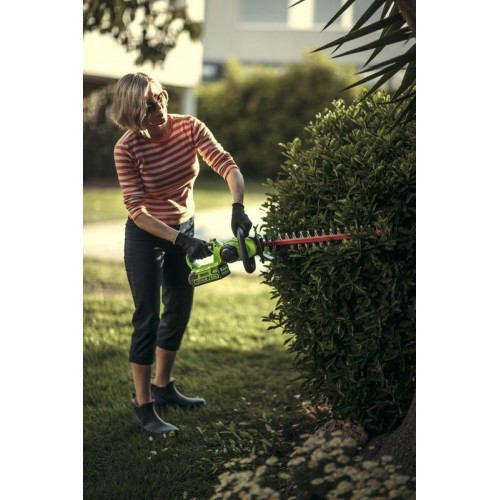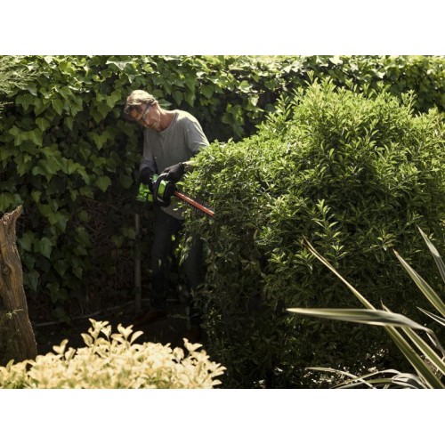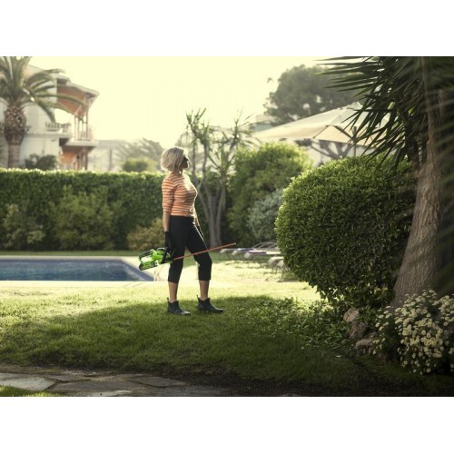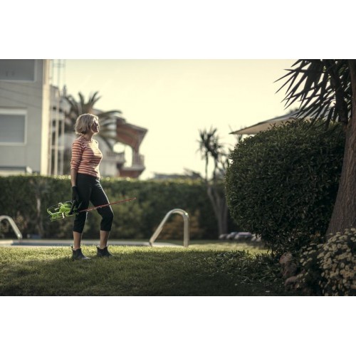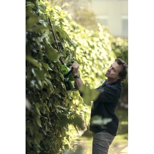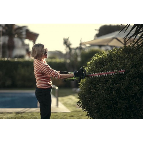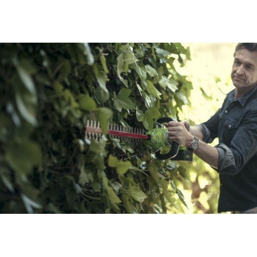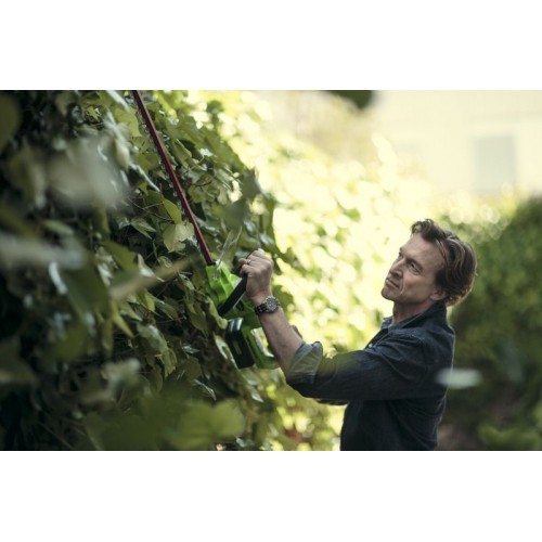 Кусторез оснащен поворотной рукояткой с углом поворота 180°. Лезвие длиною 61 см имеет алмазную заточку, а шаг среза 27 мм. Эта модель имеет вес 2,7 кг, обладает низким уровнем шума и вибрации, а также эргономичным дизайном рукоятки. Автономное время работы составляет до 80 минут от 4 Ач батареи. К преимуществам аккумуляторной техники можно отнести отсутствие необходимости использовать бензин и масло, тянуть за собой провод, не дышать вредными выбросами СО2 и не засорять окружающую среду.