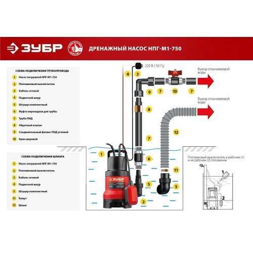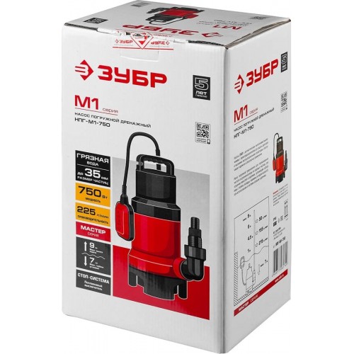 Насос дренажный погружной ЗУБР НПГ-М1-750, предназначен для автоматического перекачивания загрязнённой воды из емкостей и водоемов, организации забора воды с колодцев, скважин и подачи на высоту. Компактный высокопроизводительный насос. Универсальный насос способен перекачивать чистую и загрязненную воду с допускаемым размером частиц включений мягких фракций до 35 мм. Ударопрочный корпус насоса изготовлен из гигиенического армированного стекловолокном пластика. Поплавковый выключатель обеспечивает автоматическое вкл/выкл при изменении уровня воды. Регулировка уровней вкл/выкл насоса. Термопредохранитель для защиты от перегрева. Универсальный соединительный штуцер от 1'' до 1 1/2''. Автоматическое включение и выключение, термопредохранитель для защиты двигателя, высокие эксплуатационные свойства и простая конструкция обеспечивают надёжное и безопасное применение.