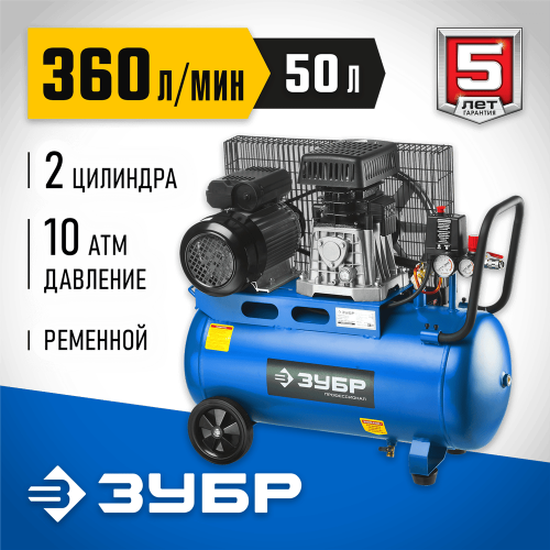 ЗУБР 2200 Вт, 360 л/мин, 50 л, ременной, масляный, компрессор электрический ЗКПМ-360-50-Р-2.2