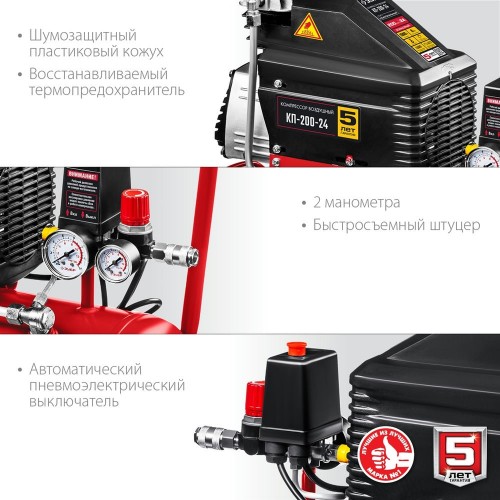 Компрессор воздушный ЗУБР КП-200-24, предназначен для накопления, хранения и подачи воздуха. Компактный и надежный безмасляный компрессор с поршневым типом пневматического механизма. Готов к работе сразу после покупки. Вырабатываемый воздух не содержит примесей масла, что не требует установки дорогостоящих маслоотделителей. Поршневой тип компрессора наиболее производителен среди другим типов. Не требует заправки маслом и контроля за наличием и его замены. Прямой привод упрощает конструкцию и увеличивает надежность. Выключатель давления обеспечивает автоматическое включение/выключение изделия при расходе сжатого воздуха. Сменный воздушный фильтр на входе защищает цилиндро-поршневую группу от абразивного износа. Быстросъемный штуцер обеспечивает удобное и быстрое подключение и отключение пневмоинструмента. Контроль давления в ресивере и на выходе при помощи двух манометров. Самовосстанавливающийся термопредохранитель. Регулировка давления на выходе.
