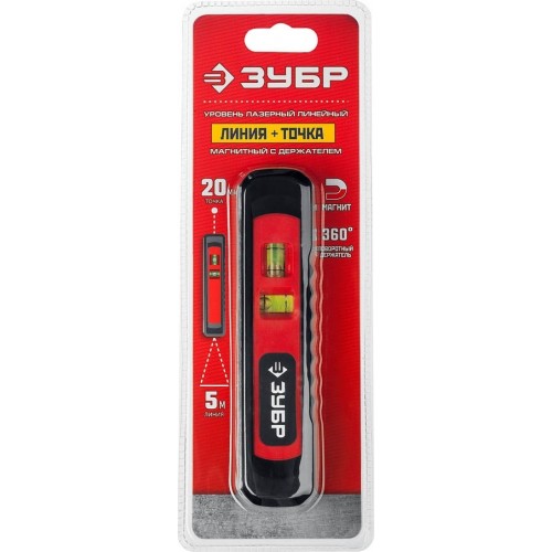 Уровень лазерный ЗУБР 34926, предназначен для проведения разметочных работ. Прибор позволяет выполнять разметку одному человеку, что значительно повышает производительность труда. Два режима проецирования: линия, точка. Раздельное включение линии и точки для удобства разметки. Две колбы для вертикального и горизонтального выравнивания. Магниты на корпусе прибора для надежного крепления на держатель. Специальный винт для регулировки позволяет выбрать угол установки. Возможность установки на штатив.