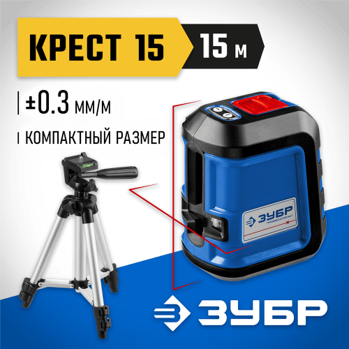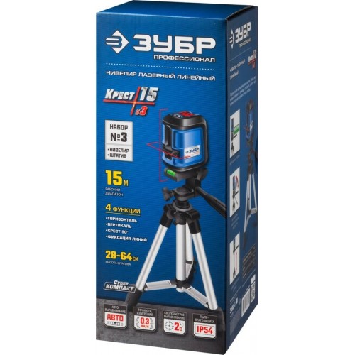 Лазерный уровень построитель плоскостей ЗУБР 34902-3_z01, предназначен для генерирования горизонтальной, вертикальной и перпендикулярных линий при проведении разметочных работ. Прибор позволяет выполнять разметку одному человеку, что значительно повышает производительность труда. Четыре режима проецирования линий: самовыравнивающаяся горизонтальная линия, самовыравнивающаяся вертикальная линия, самовыравнивающиеся перпендикулярные линии, самовыравнивающиеся перпендикулярно пересекающиеся линии, зафиксированные перпендикулярно пересекающиеся линии. Функция автовыравнивания не требует настройки, обеспечивая повышенную точность при разметке. Диапазон компенсирования ± 4° для установки на неровную поверхность. Световая индикация при превышении порогового значения угла самовыравнивания. Возможность блокировки компенсатора для защиты маятниковой системы от механических повреждений. Магнитный демпфер позволяет быстро гасить колебания. Предусмотрена установка на штатив (резьба 1/4 дюйма).