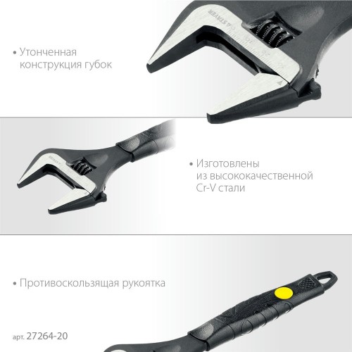 Ключ разводной STAYER 27264-20, применяется для монтажа и демонтажа крепежных элементов, имеющих шестигранный профиль. Ключ предназначен для завинчивания гаек, болтов и других деталей, изготовлен из высококачественной хромованадиевой стали, снабжен миллиметровой измерительной шкалой и фосфатированным покрытием, а благодаря наличию тонких губок, инструмент удобен для выполнения работ в труднодоступных местах.