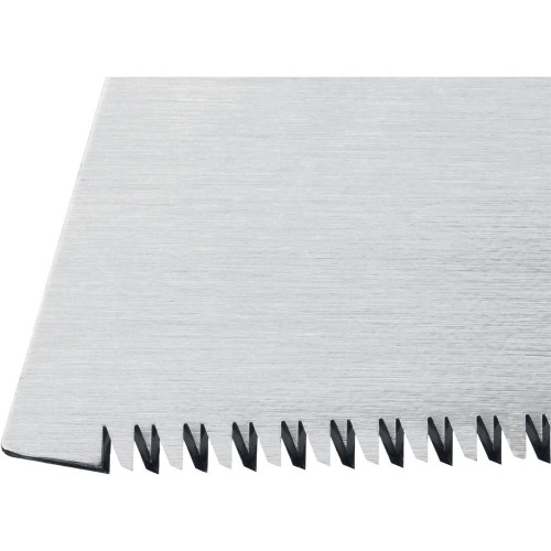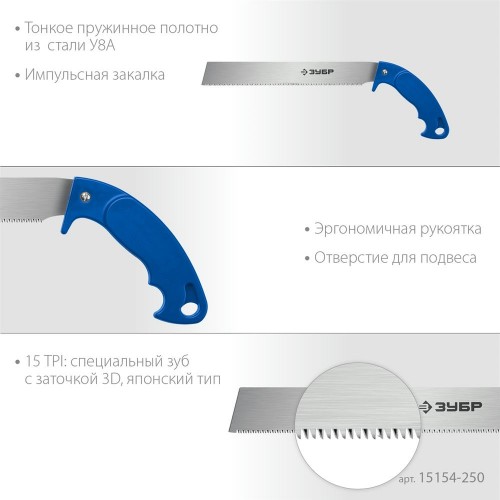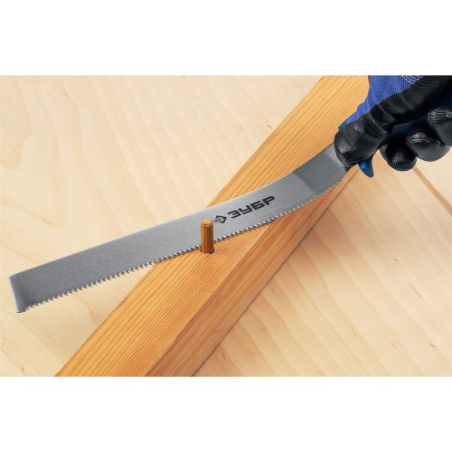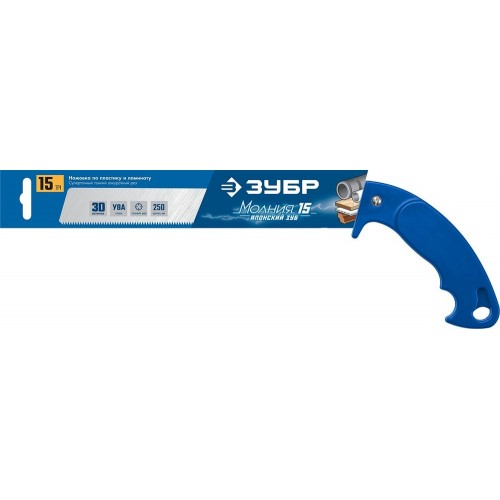 Ножовка универсальная Молния 15 ЗУБР 15154-250, предназначена для поперечной распиловки древесины различных пород. Надежный и качественный инструмент, изготовленный специально для быстрого и точного распиливания мелких заготовок из мягких и твердых сортов древесины, фанеры, ламината, пластика. Импульсная закалка каждого зуба в отдельности обеспечивает высокую твердость и механическую прочность зубьев для длительного срока службы. Изготовлена из высококачественной стали У8А. Специальный зуб японского типа обеспечивает быстрый, легкий и особо точный рез заготовок. Пиление «на себя» обеспечивает приложение минимальных усилий при максимальной скорости реза.