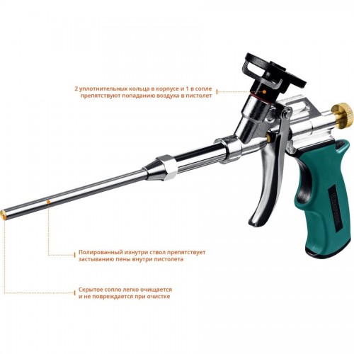 Пистолет для монтажной пены KRAFTOOL 0685_z04, применяется для профессионального нанесения монтажной пены. Высокая точность изготовления и инновационная конструкция обеспечивают герметичность и длительный срок службы. Инновационная конструкция с двумя уплотнительными кольцами в корпусе и прецизионная обработка игольчатого клапана и сопла обеспечивают надежную герметизацию, предотвращая попадание воздуха в пистолет, что минимизирует риск затвердевания пены внутри корпуса. Держатель баллонов и сопло имеют тефлоновое покрытие PTFE, облегчающее чистку. Игольчатый клапан из нержавеющей стали увеличивает ресурс инструмента. Двухкомпонентная эргономичная рукоятка. Полированный изнутри ствол препятствует застыванию пены внутри пистолета.