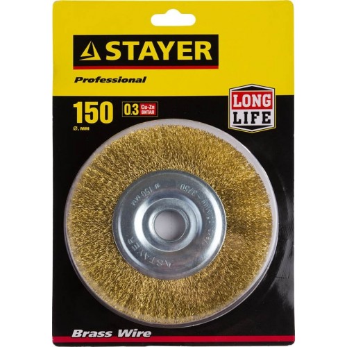 Щетка крацовка дисковая для УШМ STAYER 35122-150, предназначена для зачистки поверхностей от лакокрасочных покрытий, ржавчины, окалины и различных загрязнений с поверхностей изделий из стали и цветных металлов. Щетка изготовлена из латунированной витой проволоки. Латунированное покрытие защищает рабочую часть щетки от коррозии. Витая форма проволоки позволяет обрабатывать поверхности без повреждений.