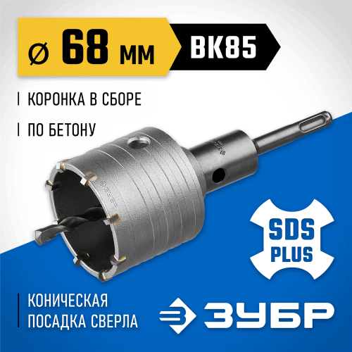 Буровая коронка ЗУБР 2918-68_z01, предназначена для сверления отверстий в бетоне, кирпиче, природном и искусственном камне, а также плотных известняках. Используется с дрелями и перфораторами мощностью не менее 850 Вт в режиме ударного сверления. При прокладке коммуникаций в строящемся здании не обойтись без коронок по бетону. Они позволяют без труда получать отверстия среднего или большого диаметра в самых прочных материалах. Коронки имеют твердосплавные зубья из сплава ВК85, усовершенствованную систему крепления сверла на конус и резьбовое соединение с державкой М22. Твердосплавные зубья из сплава ВК85 позволяют эффективно дробить обрабатываемый материал. Специальная спиралевидная форма корпуса коронки из высокопрочной стали уменьшает трение о стенки отверстия, ускоряет отвод шлама и повышает срок службы инструмента. Коронка по бетону с полной оснасткой. Державка SDS-plus из легированной стали.