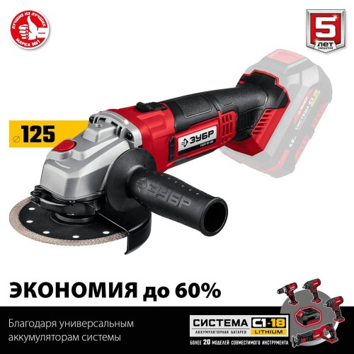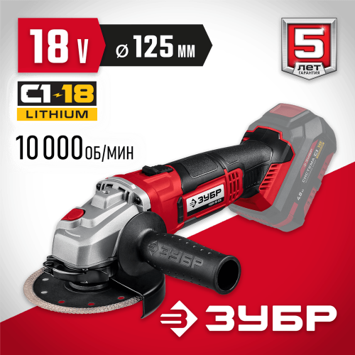 ЗУБР 18В, без АКБ, в коробке, углошлифовальная машина УШМ-18-125 Мастер