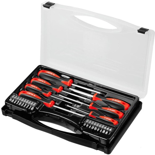 Набор отверток с битами "Универсал 27" ЗУБР 25027, предназначен для монтажа и демонтажа резьбовых соединений. Специальная закалка по особой технологии. Магнитный наконечник. Специально сконструированная эргономичная двухкомпонентная рукоятка оптимальной формы обеспечивает надежный и комфортный захват. Магнитный держатель обеспечивает быструю и надежную замену насадок. Удобный кейс для хранения и переноски.