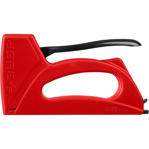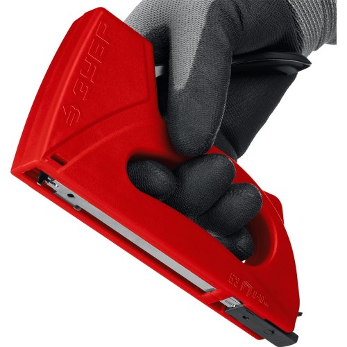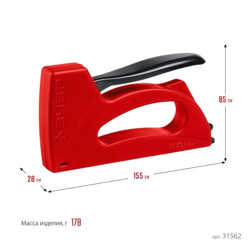 Степлер пластиковый ЗУБР Миг-53 31562, предназначен для креплении различных материалов с помощью скоб. Легкий и удобный степлер с корпусом из ABS пластика. Боек из закаленной стали. Мощный удар и работа без отдачи за счет пластинчатой пружины. Удобная и безопасная загрузка скоб снизу. Эргономичная форма рукоятки. Неразборная конструкция исключает потерю деталей.