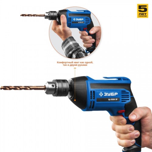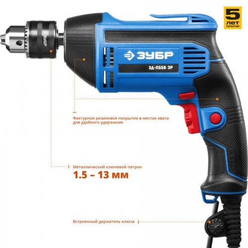 Дрель безударная электрическая ЗУБР ЗД-П550 ЭР, предназначена для сверления отверстий в различных материалах (дерево, сталь и т. д.) при установке соответствующих сверл, монтаж резьбовых соединений (при установке соответствующих бит), перемешивание ЛКМ (при установке соответствующей насадки), а также может использоваться для заворачивания крепежных изделий. Цельнометаллический ключевой патрон диаметром 13 мм для установки, в том числе, крупного расходного инструмента. Электронная регулировка оборотов от малых (для аккуратного засверливания) до высоких (для быстрого сверления). Предустановка максимальной частоты вращения для более точного контроля при работе. Надежная конструкция на шариковых подшипниках обеспечивает минимальное биение и позволяет сверлить отверстия диаметром от 3 мм. Изменение направления вращения (реверс) позволяет использовать изделие в качестве шуруповерта. Надежный хват изделия благодаря прорезиненным рукоятке и передней части корпуса.