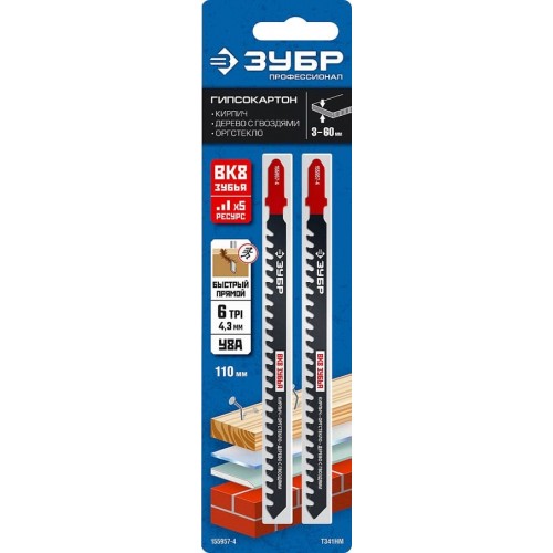 ЗУБР по гипсокартону, кирпичу, оргстеклу, дереву с гвоздями, EU-хвостовик, шаг 4.3 мм, 130/110 мм, 2 шт, полотно для эл/лобзика 155957-4 Профессионал