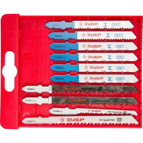 ЗУБР по дереву и металлу EU-хвост., пласт.бокс, 10 шт., набор полотен для эл/лобзика, 15586-H10