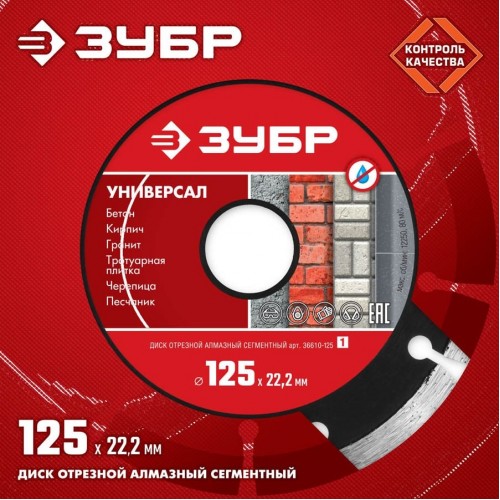 Диск отрезной алмазный сегментный для УШМ 125 х 22.2 мм, ЗУБР 36610-125_z01, предназначен для резки бетона, кирпича, тротуарной плитки, бордюрного камня и других строительных материалов без принудительного охлаждения. Корпуса алмазных кругов изготовлены из прочной легированной стали, способной выдержать значительную механическую нагрузку и высокую температуру. Оригинальная сегментная форма режущей кромки позволяет быстро и эффективно осуществлять необходимые резы в обрабатываемом материале. Высококачественные синтетические алмазы. Оптимально подобранные компоненты металлической связки гарантируют продолжительный рабочий ресурс круга при работе даже с самыми сложными в обработке материалами. Сегменты обеспечивают хороший выброс шлама и эффективную работу.