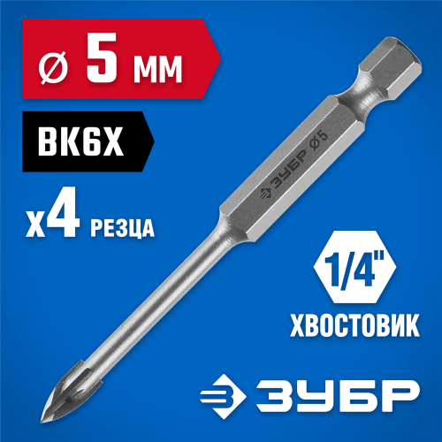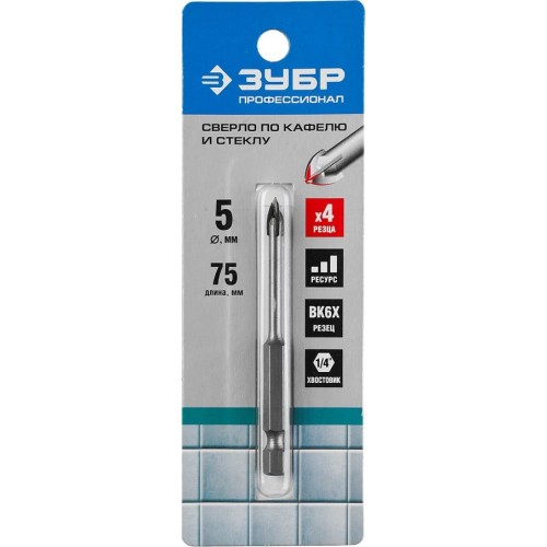 Сверло по кафелю и стеклу 5 мм ЗУБР 29845-05_z01, применяется для сверления отверстий в стекле, керамической и кафельной плитке, мраморе. Четыре резца. Благодаря четырём режущим лезвиям сверление осуществляется в два раза эффективней. Наконечник сверла из твердого сплава BK6Х. Специальная заточка режущих кромок улучшает прохождение материала. Шестигранный хвостовик для предотвращения проворачивания в сверлильном патроне. Специальная проточка хвостовика 1/4" для использования быстросъемных адаптеров.
