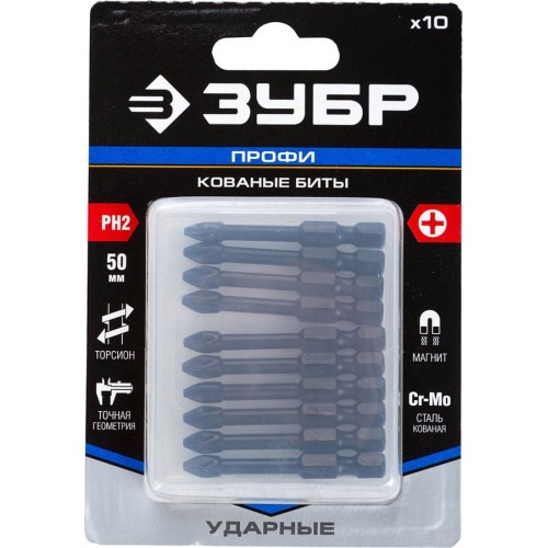 ЗУБР PH2, 50 мм, 10 шт., кованые биты "ПРОФИ" Phillips 26021-2-50-S10