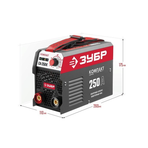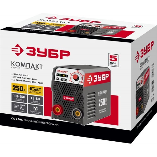 Сварочный инвертор ЗУБР СА-250К, предназначен для ручной электродуговой сварки с применением плавких электродов (ММА). Сварочный инвертор по технологии IGBT: плавная регулировка сварочного тока в широком диапазоне, малое потребление электроэнергии, высокий КПД, простота работы и высокое качество сварного шва, сварка различных металлов, меньшее количество силовых элементов (при той же мощности) и, соответственно, выше надежность и меньше вес и размеры по сравнению с технологией MOSFET. Качественные компоненты позволяют работать дольше, проще и качественнее. Сварка постоянным током обеспечивает лучшее качество сварочного шва по сравнению со сваркой переменным током. Устойчивая работа при колебаниях сетевого напряжения до 160 В. Защита от пыли (покрытие платы специальным высокотемпературным лаком). Принудительное охлаждение гарантируют увеличенную производительность. Малый вес и габариты увеличивают мобильность и позволяют работать в труднодоступных местах.