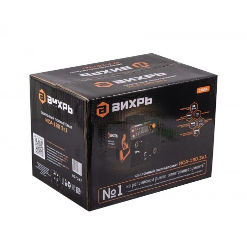 Вихрь ИСА-180 3в1 работает с порошковой проволокой диаметром 0.8 и 1.0 мм. Полуавтомат оборудован встроенным подающим механизмом. Комплектация устройства включает сварочную горелку длиной 1,5 м. Длина кабеля заземления − 1.2 м, а электрододержателя − 1.5 м.