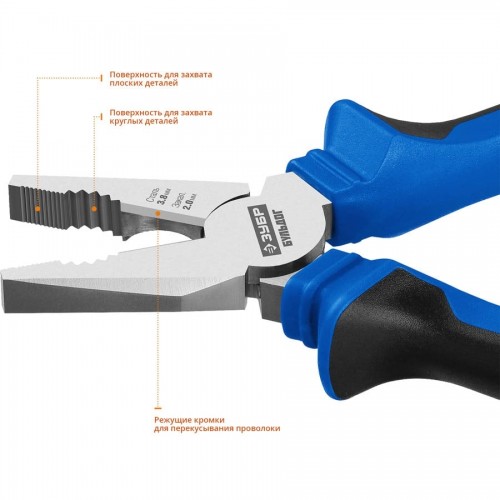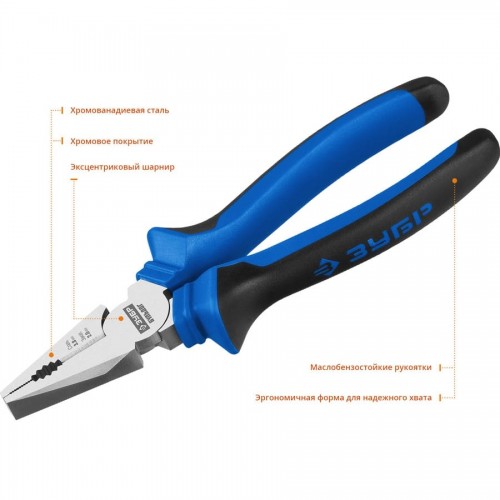 Плоскогубцы комбинированные ЗУБР 2201-1-18_z02, предназначены для выполнения слесарных, монтажных и ремонтных работ. Разработаны для захвата и удержания плоских и круглых предметов, перекусывания проволоки средней твердости (стальная проволока – до 3.8 мм, закаленная проволока – до 2.0 мм). Эксцентриковое расположение шарнира увеличивает передачу усилия на 70%. Закаленные рабочие поверхности. Инструментальная сталь, легированная хромом и ванадием, для оптимального баланса твердости и прочности. Хромовое защитное покрытие. Эргономичные двухкомпонентные противоскользящие рукоятки создают максимальное удобство при работе.