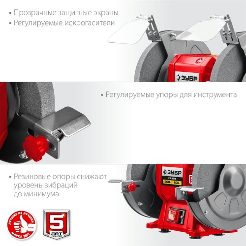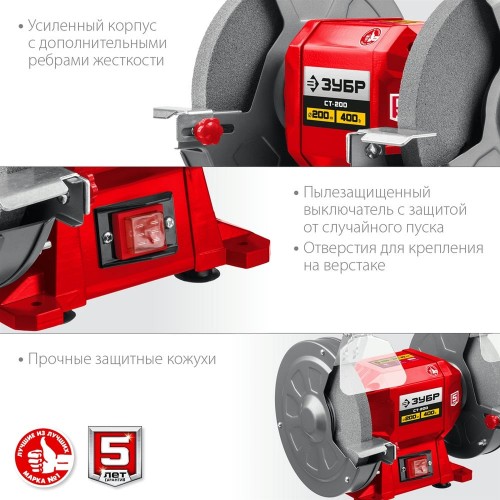 Станок заточной ЗУБР СТ-200 – незаменимый инструмент для гаража, мастерской, используемый для заточки и сухой шлифовки металлических заготовок и режущего инструмента. Простота конструкции, высокая надежность, компактный размер, два камня с разной зернистостью – все что нужно для настоящего мастера, ценяще-го качество и рассчитывающего на долгий срок службы