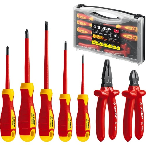 Набор губцевого инструмента ЗУБР 2214-H7_z01, предназначен для выполнения электромонтажных работ под напряжением до 1000 В, захвата и удерживания мелких предметов, перекусывания проволоки средней твердости и других слесарных и монтажных работах. Оптимальный баланс длины и диаметра рукояток обеспечивают удобный захват, комфортную и эффективную работу. Специально сконструированная противоскользящая рукоятка отверток с упором для большого пальца обеспечивает максимальную передачу крутящего момента от руки к профилю крепежа. Стержни отверток изготовлены из хромованадиевой стали. Рабочие поверхности всех инструментов закалены по особой технологии.