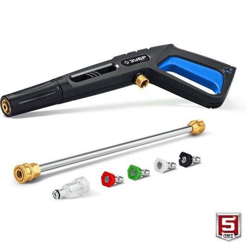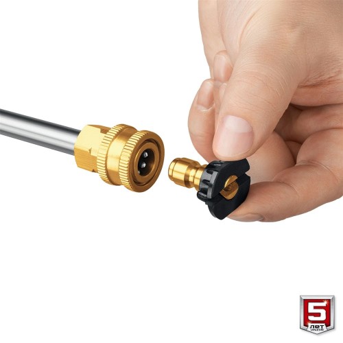 • Сменные быстросъемные насадки с различными углами распыления для формирования струи различного давления, а также нанесения моющего средства: