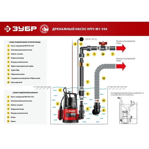 Насос погружной дренажный для чистой воды НПЧ-М1-550, предназначен для защиты двигателя, высокие эксплуатационные свойства и простая конструкция обеспечивают надёжное и безопасное применение для перекачивания чистой и загрязнённой воды на садовых участках, при осушении ёмкостей и водоёмов, организации забора воды с глубины (колодцы, скважины) и подачи на высоту, использовании в системах аэрации и дренажа. Имеется автоматическое включение и выключение. Ударопрочный корпус насоса изготовлен из гигиенического армированного стекловолокном пластика. Поплавковый выключатель обеспечивает автоматическое вкл/выкл при изменении уровня воды. Регулировка уровней вкл/выкл насоса. Термопредохранитель для защиты от перегрева. Универсальный соединительный штуцер от 1'' до 1 1/4''.