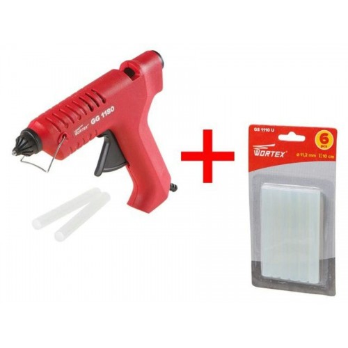 Пистолет клеевой WORTEX GG 1180 в блистере + 2 клеевых стержня+АКЦИЯ (В ПОДАРОК Клеевые стержни WORTEX (универс., 11.2х100 мм, 6 шт в блистере))