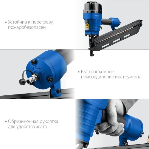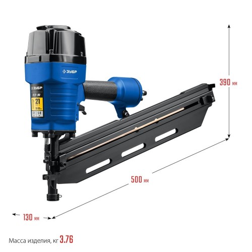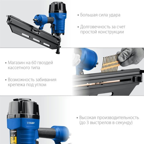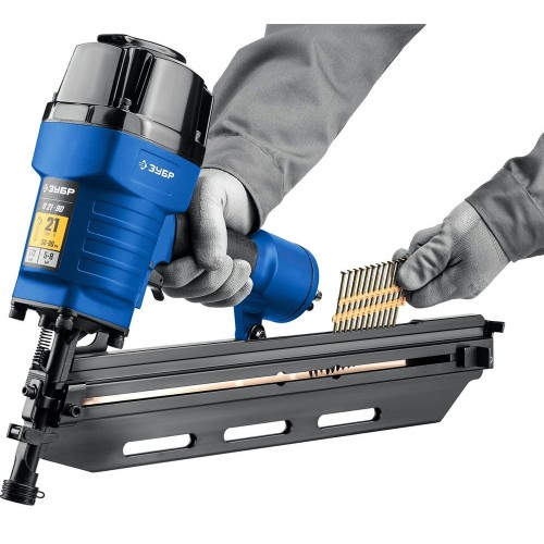 Нейлер (гвоздезабиватель) пневматический для гвоздей ЗУБР П21-90 31931, предназначен для сборки каркаса в строительстве и промышленной упаковке (поддоны, ящики). Возможность забивания крепежа под углом. Высокая производительность (до 3 выстрелов в секунду). Широкий диапазон применения нейлера: от производства упаковки до строительства домов. Применяемый тип расходных материалов - гвозди тип 21 (50-90 мм). Количество гвоздей в магазине - 60 шт. Угол магазина - 21 град. Прочный алюминиевый корпус. Устойчив к перегреву, пожаробезопасен. Обрезиненная рукоятка для удобства хвата.