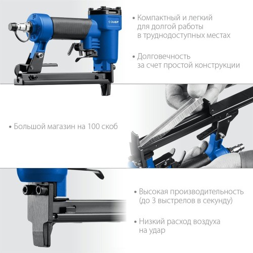 Степлер пневматический (скобозабиватель) ЗУБР 31934, предназначен для внутренней отделки, например, при обшивке стен и потолков или монтаже плинтусов. Литой алюминиевый корпус. Обрезиненная рукоятка для удобства хвата. Простота в использовании. Устойчив к перегреву, пожаробезопасен. Низкое потребление воздуха на удар. Обрезиненная рукоятка для удобства хвата. Большой магазин на 100 скоб.
