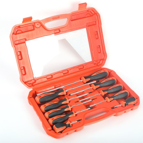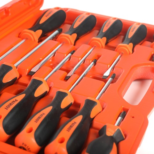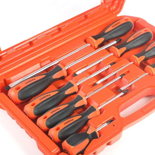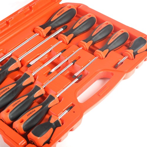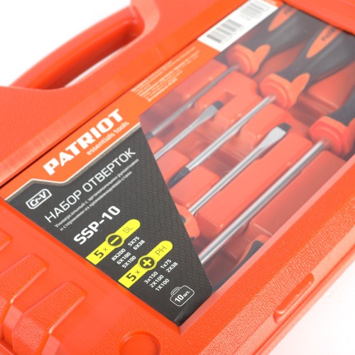 Комплект из десяти отверток PATRIOT SSP-10. В набор входят пять крестообразных отверток типа PH (PH1x75, PH1x100, PH2x100, PH2x38, PH3x150) и пять плоских типа SL (SL5x75, SL5x100, SL6x100, SL6x38, SL8x200). Стержни всех инструментов выполнены из прочной и стойкой к износу хромованадиевой стали и имеют магнитные наконечники. Мягкие композитные рукояти предотвращают выскальзывание и делают работу комфортной.