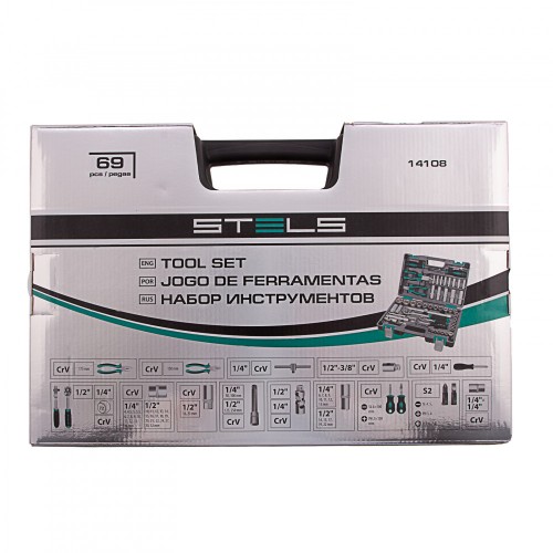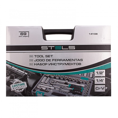 Набор инструментов, 1/2, 1/4, CrV, пластиковый кейс, 69 предметов Stels, ( 14108 )
