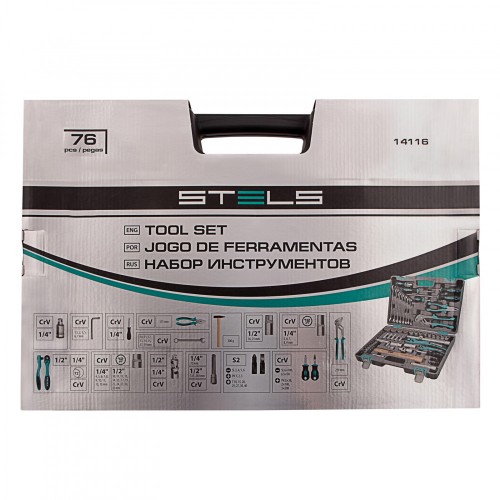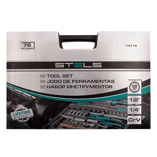 Набор инструментов, 1/2, 1/4, CrV, пластиковый кейс, 76 предметов, двенадцатигранные головки Stels, ( 14116 )