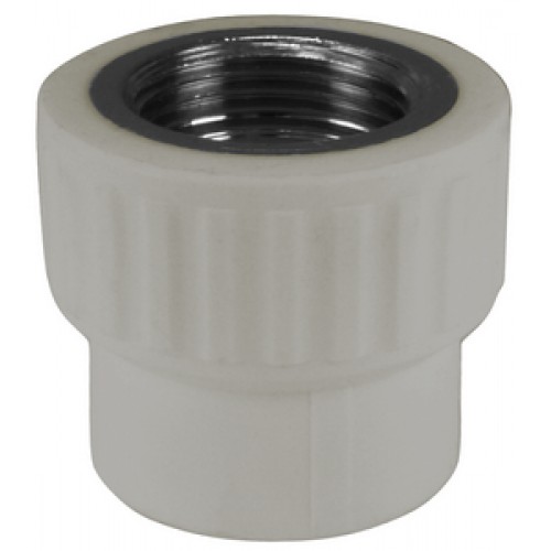Комбинированный полипропиленовый фитинг, закладная деталь изготовлена из латуни марки ЛС-59-1. Используется для соединения полипропиленовой трубы и элемента системы с резьбовым соединением. Латунные части производятся методом горячего штампования, пластиковые - методом литья под давлением.