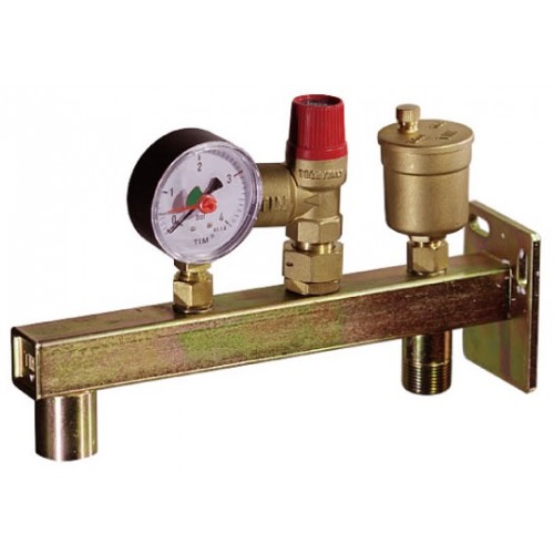 Группа безопасности котла предназначена для автономных систем водяного отопления и ГВС мощностью до 44 кВт и давлением до 10 бар. Включает в себя смонтированные на латунном никелированном корпусе предохранительный клапан с фиксированной настройкой 3 бара, манометр и автоматический воздухоотводчик. Устанавливается на линии подачи теплоносителя от котла.