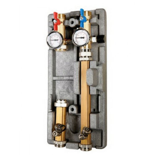 Модули быстрого монтажа VARIMIX – продуманные конструкторами, компактно собранные и теплоизолированные в заводских условиях арматурные узлы. Их применение позволяет до минимума сократить время проектирования и монтажа системы теплоснабжения коттеджа, таунхауса, небольшого коммерческого объекта и т.д., избежать проектных и монтажных ошибок. При этом стоимость готового модуля ниже стоимости аналогичного по составу набора элементов, приобретаемых по отдельности. Насосный модуль VAR 11 предназначен для присоединения к коллекторному модулю VAR 30 высокотемпературного водяного контура, в котором предусмотрено ручное или автоматическое регулирование расхода теплоносителя. Для защиты циркуляционного насоса такого контура от работы «на закрытую задвижку», а также для сохранения гидравлической устойчивости системы в целом в модуле предусмотрен байпас с регулируемым перепускным клапаном. Линии подачи и «обратки» оснащены поворотными дренажными кранами, стрелочными термометрами, ручными воздухоотводчиками. На выходе подающего трубопровода установлен шаровой кран, в возвратной линии – обратный клапан. Модуль снабжен также теплоизоляцией из пенополистирола и средствами крепежа. Насос заказывается отдельно, в зависимости от гидравлических характеристик подсоединяемого контура. Монтажная длина насоса – 180 мм. Материал трубопроводов модуля – бронза марки OTS 60PB2 (EN 1982-00). Их условный диаметр – 32 мм. Соединение с трубами обслуживаемого контура – с помощью наружной резьбы G 1 1//4". Максимальная тепловая мощность присоединенной системы – 100 кВт (при Δt = 20 °С).