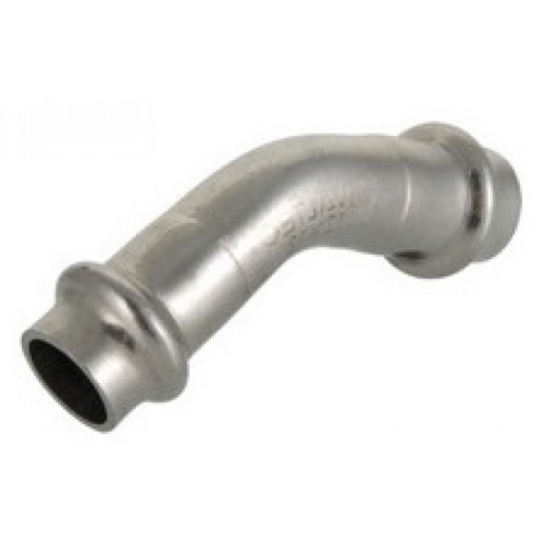 Двухраструбный пресс-угольник 45° из нержавеющей стали обеспечивает соединение тонкостенных стальных труб систем водоснабжения, отопления, иных инженерных и технологических установок с рабочей температурой до 95 °С и давлением до 16 бар. Изделие изготовлено из стали AISI 304. Материал уплотнительных колец – эластомер EPDM Sh70. Благодаря бесштуцерной конструкции соединитель обладает малым коэффициентом местного сопротивления – сужение канала практически отсутствует. Фитинг рассчитан на обжатие с помощью пресс-инструмента V-профиля.