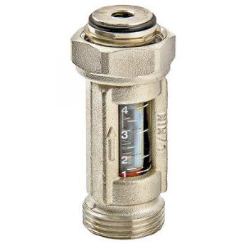 Расходомер (другое название – ротаметр) обеспечивает возможность визуально контролировать расход теплоносителя в присоединенных к коллектору петлях. Это облегчает наладку водяного теплого пола, радиаторного отопления с горизонтальной разводкой, прочих многоконтурных систем с рабочей температурой до 90 °C. Правильное направление потока жидкости указано на корпусе расходомера стрелкой. В установке напольного обогрева прибор монтируется на отводы обратного коллектора. При использовании совместно с коллекторным блокам VTc.594 гидравлическая настройка системы осуществляется встроенными регулировочными клапанами при помощи ключа SW5. Шкала расходомера отградуирована в диапазоне 1–4 л/мин. Материалы изделия: латунь CW617N (корпус), полипропилен (поплавок), прозрачный поликарбонат (трубка со шкалой), нержавеющая сталь (пружина). Номинальное давление – 10 бар. Присоединение расходомера – «евроконус», накидная гайка/наружная резьба.