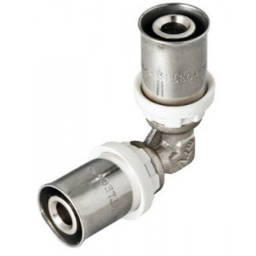 Пресс-фитинг – угольник, обеспечивающий соединение труб (металлопластиковых или из сшитого полиэтилена) под углом 90 градусов. Особенности конструкции изделия, используемые материалы обусловили надежность соединений, повышенную пропускную способность, температурную стойкость, механическую прочность. При изготовлении пресс-угольника используются высококачественные материалы: сантехническая латуни CW617N с никелевым покрытием (корпус), нержавеющая сталь (гильза), EPDM (уплотнительные кольца, 2 шт. для каждого штуцера). Фиксатор, одновременно играющий роль диэлектрической прокладки, делается из нейлона. Монтаж соединителя выполняется пресс-инструментом с насадкой «ТН».