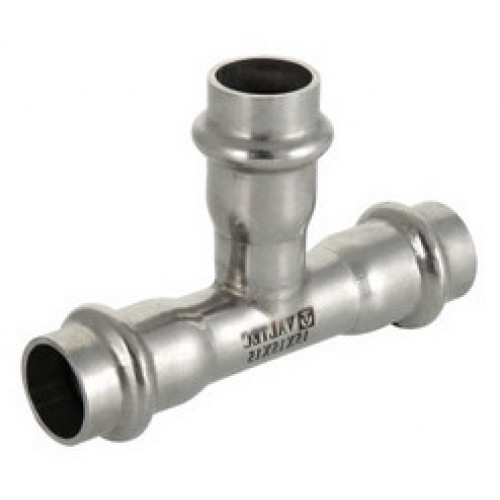 (VTi.931.I) Трехраструбный пресс-тройник из нержавеющей стали обеспечивает соединение трех тонкостенных стальных труб систем водоснабжения, отопления, иных инженерных и технологических установок с рабочей температурой до 120 °С и давлением до 16 бар. Изделие изготовлено из стали AISI 304. Материал уплотнительных колец – эластомер EPDM. Отдельно можно приобрести уплотнительные кольца из FPM (витон); в этом случае максимальная рабочая температура увеличивается до 140 °С.
