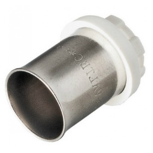 Гильза с обоймой-фиксатором для пресс-фитинга VALTEC. Материал гильзы – пластичная нержавеющая сталь марки AISI 304, обоймы-фиксатора – нейлон PA 6. Гильза имеет монтажный раструб. Конструкция фиксатора обеспечивает правильное расположение пресс-насадки инструмента на соединителе, контроль полноты одевания металлополимерной трубы на штуцер, отсутствие электрического контакта алюминиевой прослойки трубы и латунного корпуса фитинга. Усилие обжатия гильзы – не более 1200 Н.