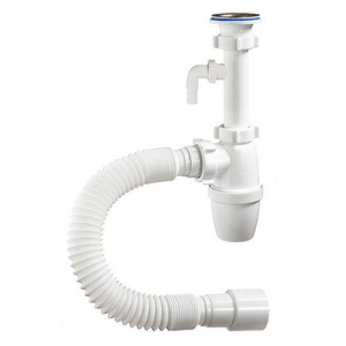 Сифон с малым корпусом и отстойником для тюльпана и умывальника, выпуском с нержавеющей чашкой д.63мм и отводом для слива от стиральной машины. В комплекте удлинённый патрубок – удобен в установке сифона в ножку тюльпана, винт 100мм для утолщённых моек и отвод в канализацию гибкая труба 40-40/50.
