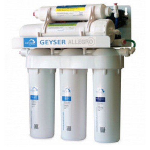 Технология обратного осмоса, использованная в фильтре Гейзер Аллегро П, заключается в фильтровании воды через полупроницаемую мембрану. Размеры пор мембраны настолько малы, что пропускают только молекулы воды. Размер молекул большинства примесей, а также бактерий и вирусов значительно больше молекул воды, поэтому они не проходят через мембрану. Фильтр Гейзер Аллегро П работает при давлении в подводящей магистрали не менее 2 атм. Устройство повышения давления, входящее в комплект, повысит уровень давления до 3-6 атм.