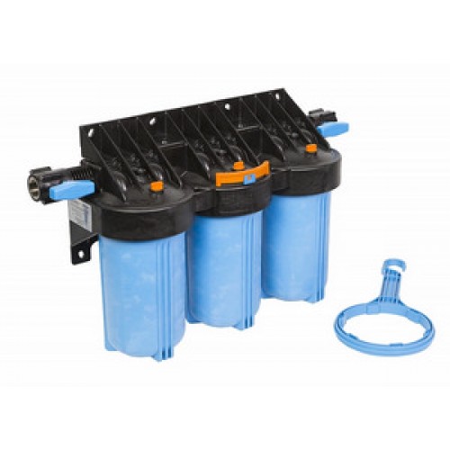 Корпус фильтра 1 M 10 T3 выполнен из синего поликарбоната. Основание корпуса имеет латунные закладные и комплектуется пластиковым кронштейном и ключом.