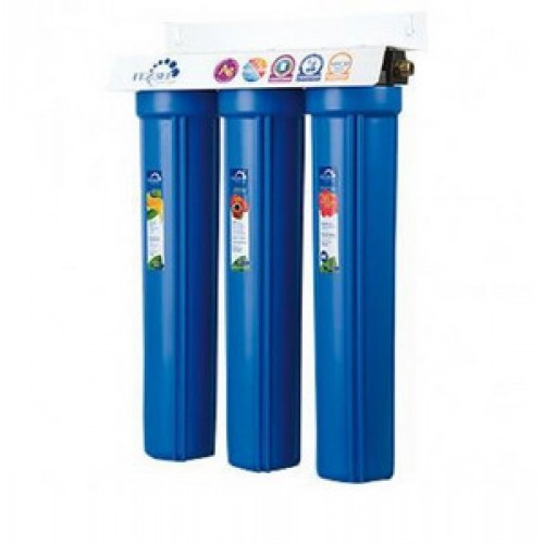 Трёхступенчатый стационарный фильтр Гейзер 3И20ВВ на раме. Устанавливается на магистраль холодного водоснабжения на входе дачи, дома, коттеджа. Дополнительно укомплектован приборами контроля манометр, расходомер (для своевременной замены картриджей).