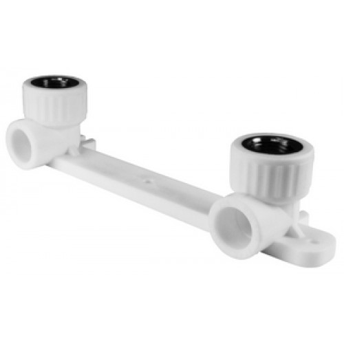 Комплект настенный для смесителя представляет из себя комбинированный полипропиленовый фитинг. Используется для монтажа к трубопроводу и установки смесителя непосредственно на стене. Латунные части производятся методом горячего штампования, пластиковые - методом литья под давлением.